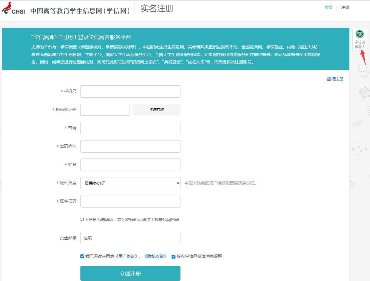 如在注册信息时遇到如:填写证件号码后提示证件号码已被注册的问题;重新注册;填写手机号码时提示已被注册的问题;如何修改学信网账号中的手机号码......等技术问题,请点击上图中“学信机器人”位置,相关问题系统均有解答。